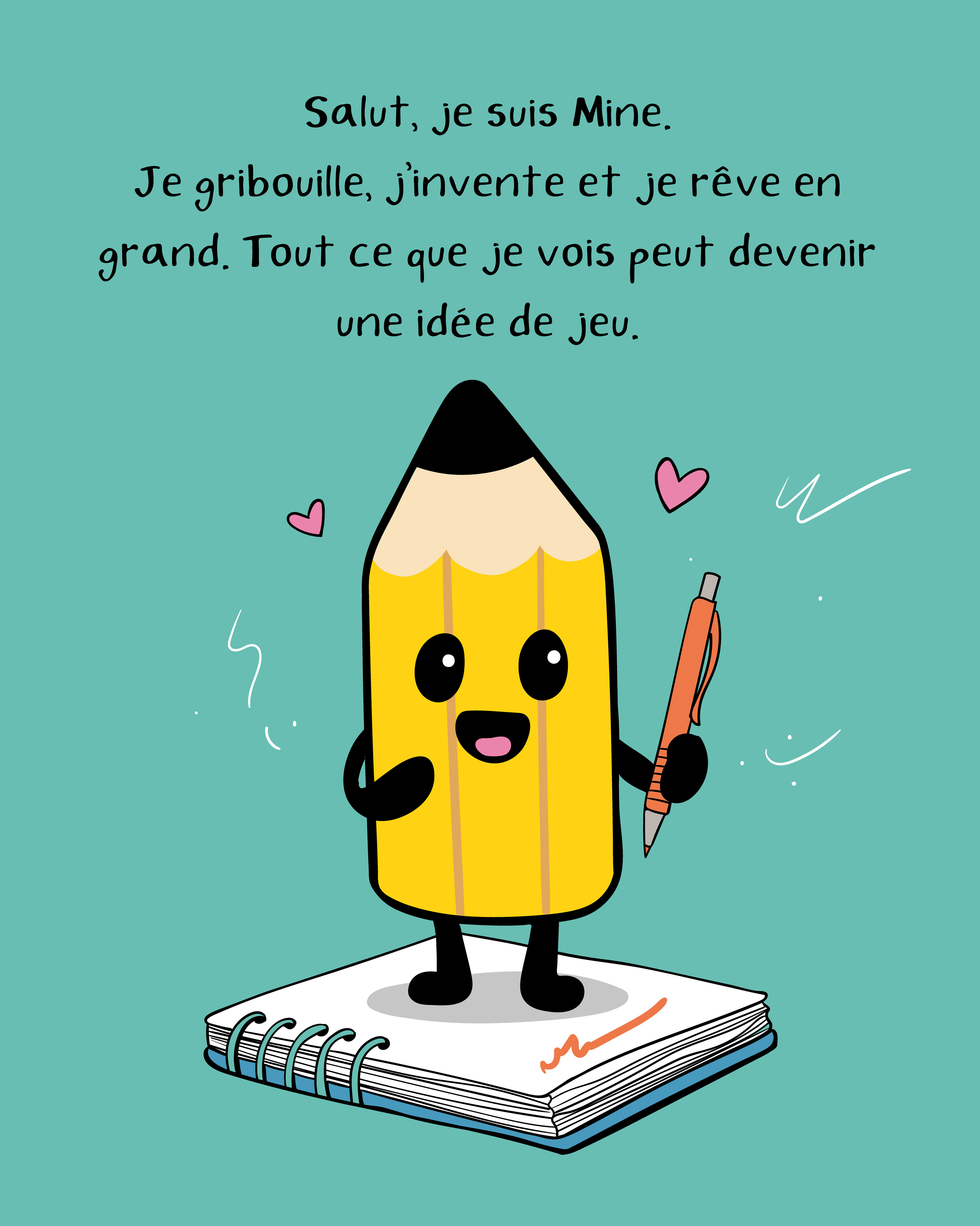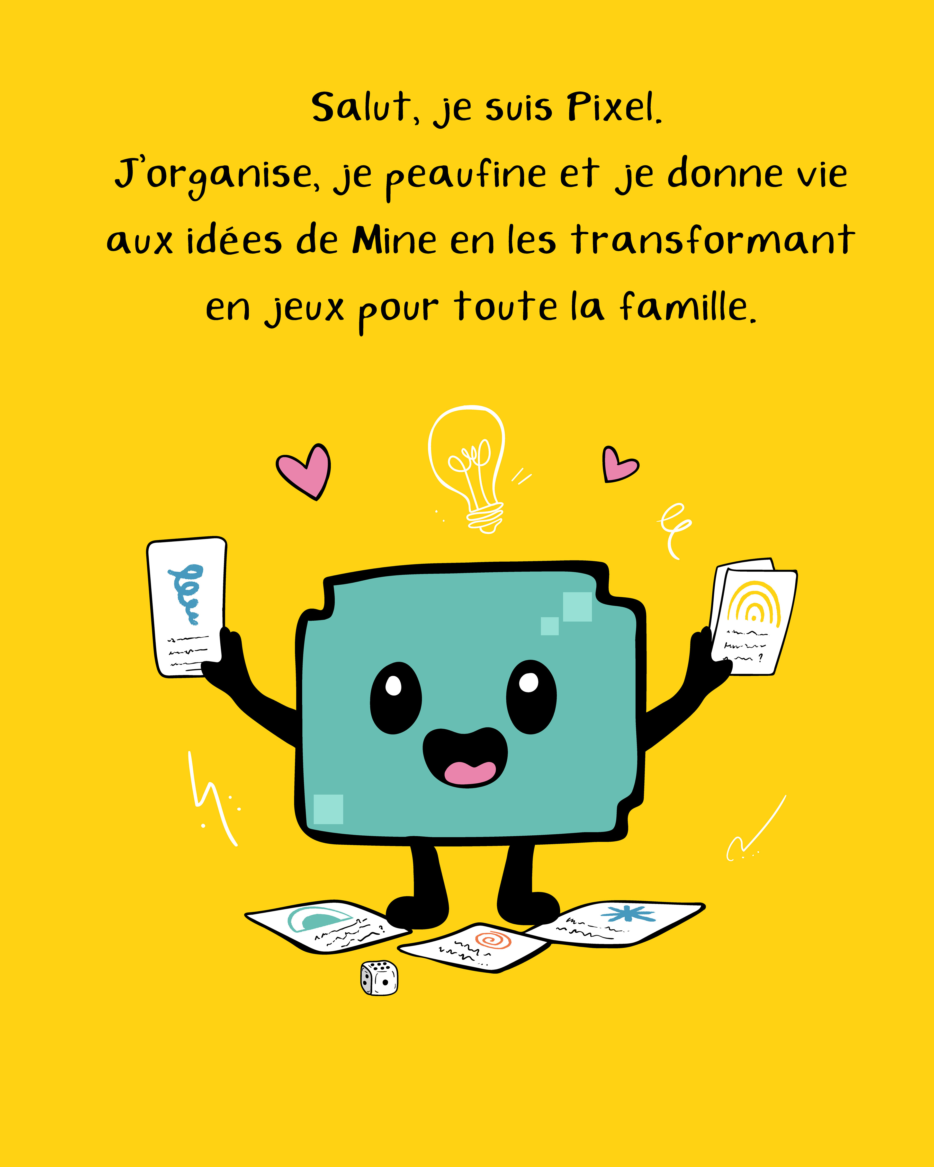 Pendant 7 ans, j’ai eu la chance de travailler pour une compagnie de jeux pour enfants. Cette expérience a nourri ma passion… mais aussi mon envie de voler de mes propres ailes ! Ce besoin de liberté créative m’a poussée à fonder Mine et Pixel : une petite maison de création où l’on imagine des jeux à imprimer, remplis de curiosité, d’aventure et de magie du quotidien.